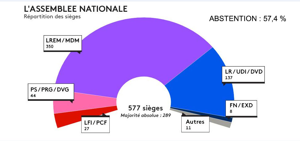La composition de la nouvelle Assemblée nationale est plus que jamais déconnectée de la réalité politique du pays. Après avoir réuni 8,6 millions de voix au premier tour de la présidentielle, Macron pourra s'appuyer sur une majorité absolue de 350 députés de LREM/Modem. De son côté, Mélenchon avait réuni 7 millions de voix à la présidentielle, mais l'Assemblée nationale ne comptera que 27 députés de la France insoumise (FI) et du PCF (ou 28 si, par bonheur, Valls est finalement battu).